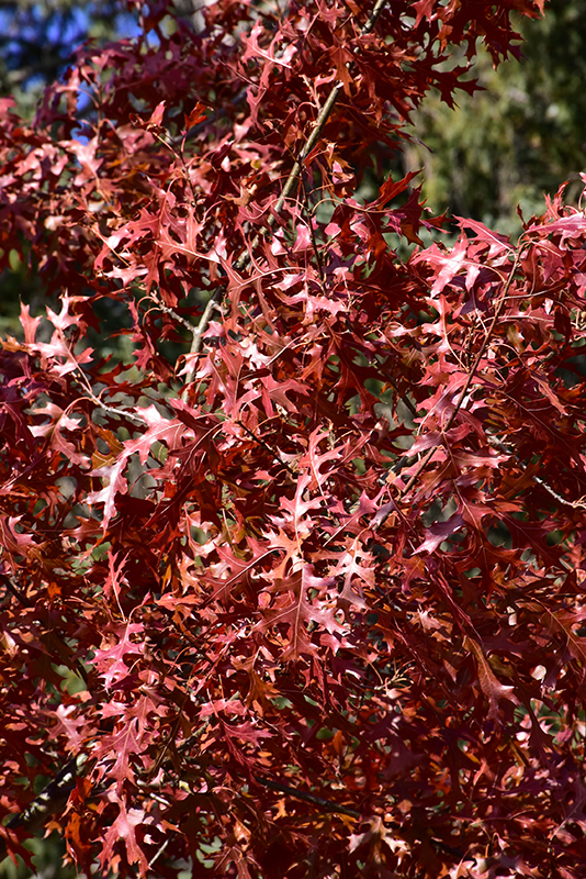 Majestic Skies™ Northern Pin Oak has dark green deciduous foliage which emerges brick red in spring on a tree with an oval habit of growth. The glossy lobed leaves turn an outstanding red in the fall. However, the fruit can be messy in the landscape and may require occasional clean-up. The furrowed gray bark and silver branches add an interesting dimension to the landscape.