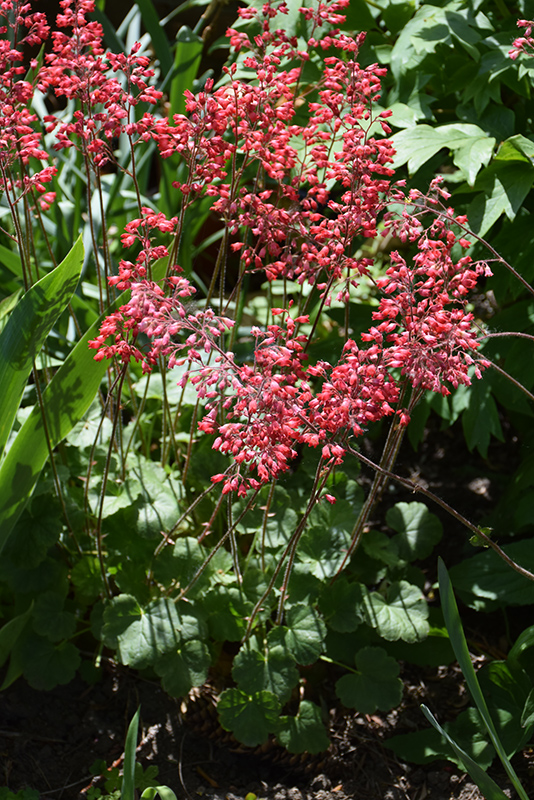 Firefly Coral Bells will grow to be about 12 inches tall at maturity extending to 20 inches tall with the flowers, with a spread of 18 inches. When grown in masses or used as a bedding plant, individual plants should be spaced approximately 15 inches apart. Its foliage tends to remain dense right to the ground, not requiring facer plants in front. It grows at a medium rate, and under ideal conditions can be expected to live for approximately 10 years. As an evegreen perennial, this plant will typically keep its form and foliage year-round.