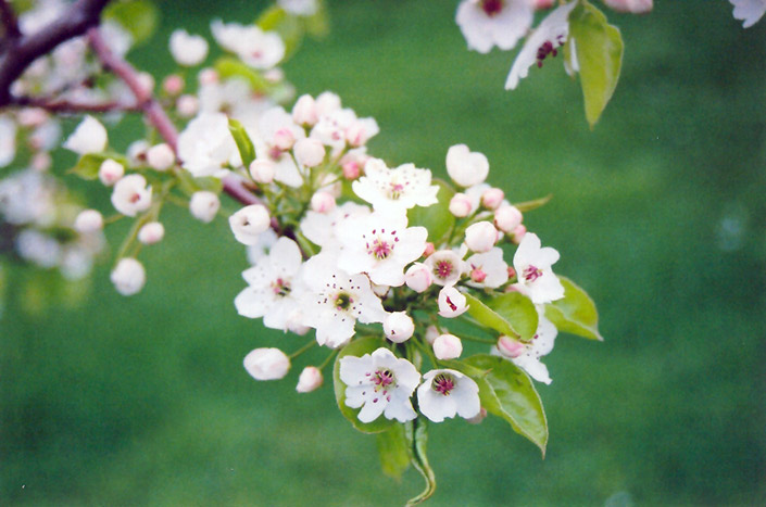 A large ornamental fruit tree producing smallish sweet yellow-green pears in fall, very showy white flowers in spring and an upright oval habit; one of the hardier pears, needs a pollinator, fallen fruit can be messy, can be susceptible to fireblight