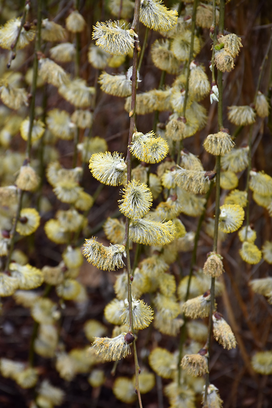 Weeping Pussy Willow features delicate tan catkins along the branches from late winter to early spring before the leaves. The flowers are excellent for cutting. It has dark green deciduous foliage. The pointy leaves turn yellow in fall.