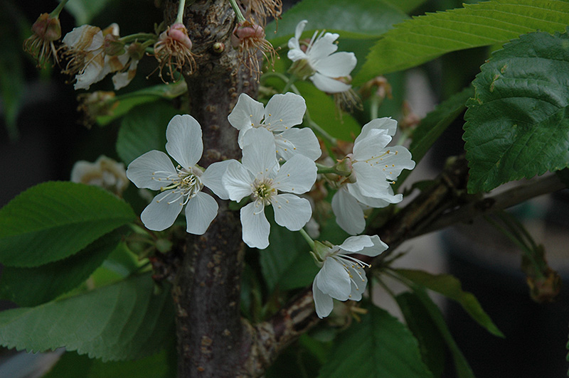 A popular fruit tree with showy white flowers in spring followed by sweet golden-yellow cherries with a reddish blush; needs full sun, well drained soil, and a pollinator
