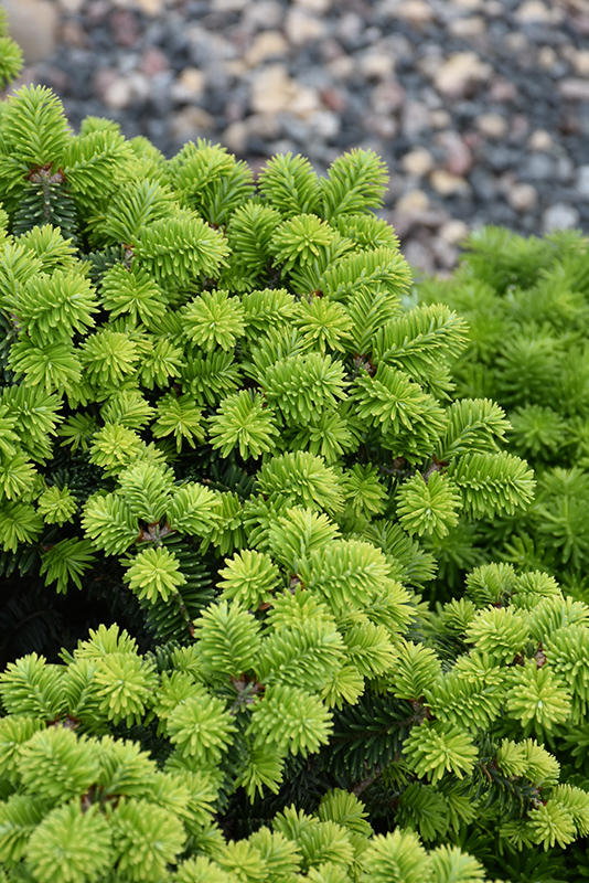 Tiny, uniform dark green needles radiate around many short branches on this very small and fine variety; great for containers and rock gardens; prefers moist, acidic soils but should do well in most garden soils, best in full sun