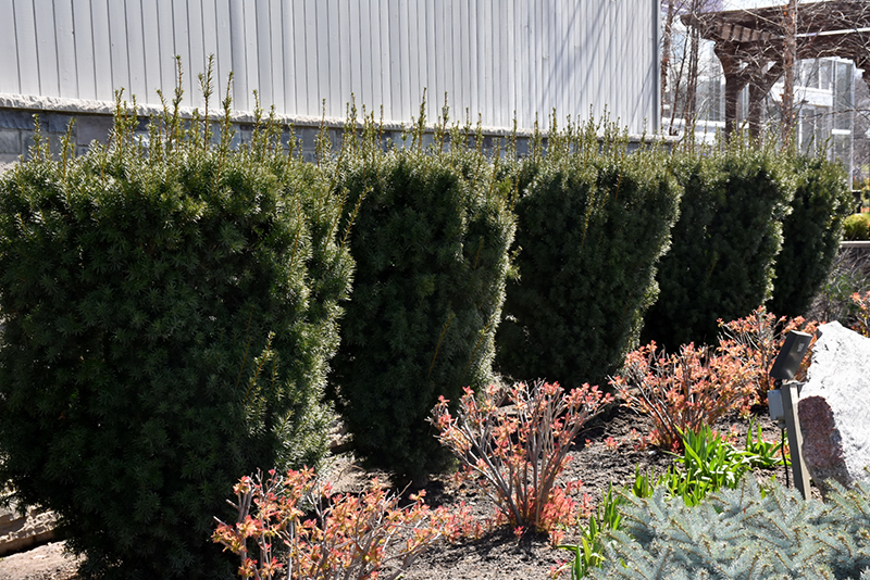 A top notch landscape shrub featuring a dense, upright habit and bright green emerging foliage held over dark evergreen needles in spring; becomes quite large, makes a great hedge, takes pruning very well; one of the few evergreens that loves shade