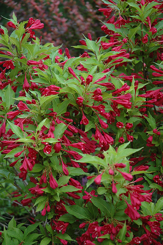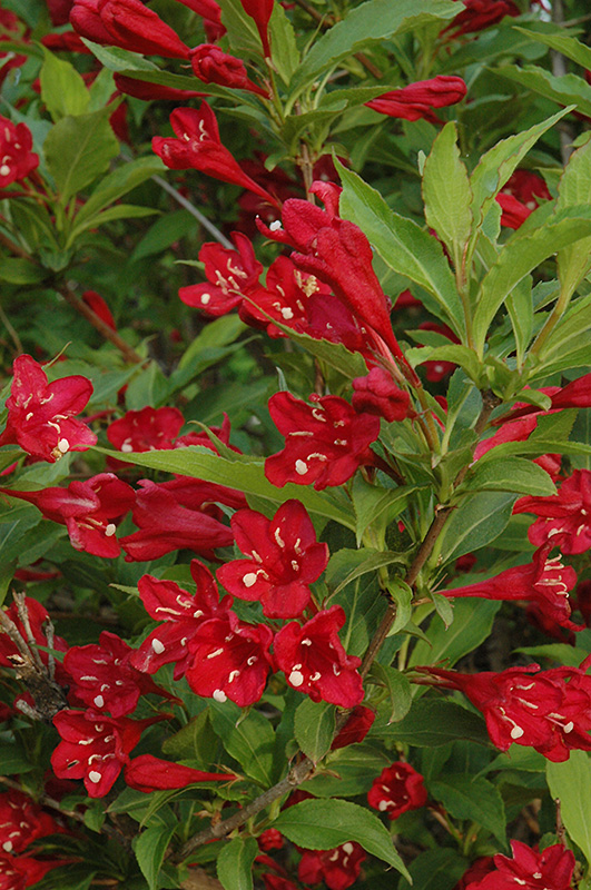 Red Prince Weigela is draped in stunning clusters of red trumpet-shaped flowers along the branches from late spring to mid summer. It has forest green deciduous foliage. The pointy leaves do not develop any appreciable fall color.