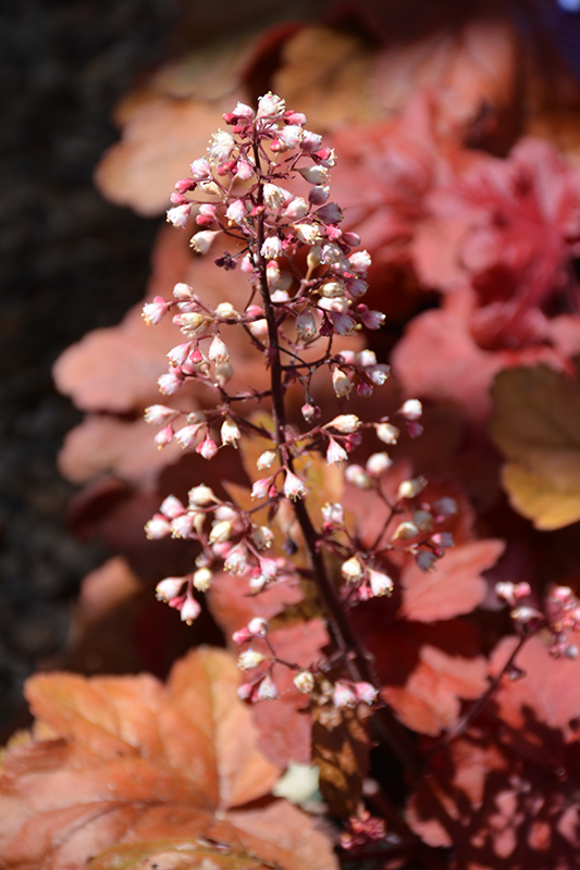 Fire Alarm Coral Bells features dainty spikes of pink bell-shaped flowers rising above the foliage in early summer. Its attractive tomentose lobed leaves emerge crimson in spring, turning orange in color with distinctive dark red veins. The foliage often turns crimson in fall.