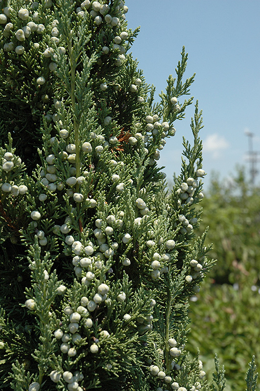 A narrow columnar evergreen shrub, makes a great accent or articulation plant in home landscapes; interesting blue-green needle-like foliage and extraordinary, large silver-blue berries; a very versatile landscape plant, needs full sun