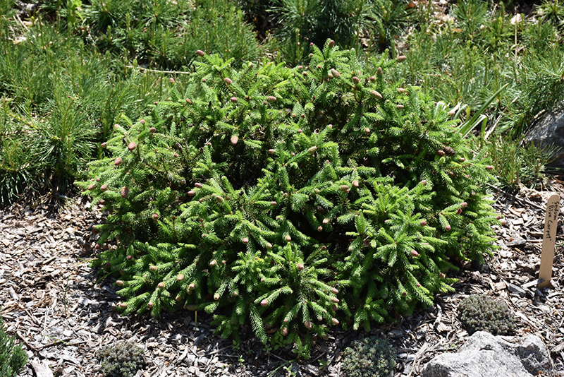 A slow-growing dwarf conifer with lime green new growth that matures to deep green; distinctive red cones in spring mature to brown and persist to the next year; adaptable and hardy