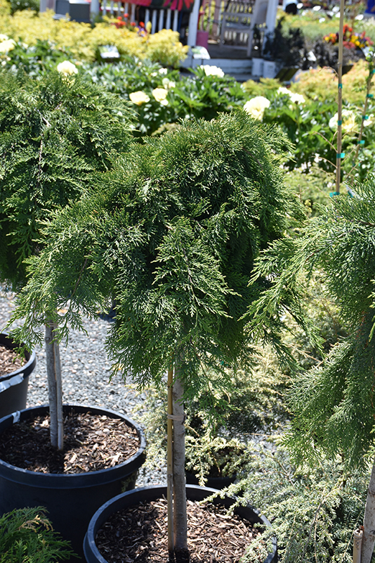 A grafted tree form of this hardy variety; gently arching branches closely resemble that of a juniper, but with the foliage of arborvitae; unlike juniper, performs very well in shade, also needs well-drained but moist soils and wind protection