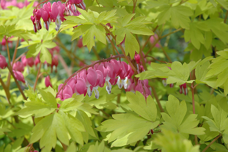 Lovely mounds of chartreuse-yellow foliage create a stunning backdrop for arching stems of nodding pink, heart-shaped flowers; excellent performance in borders and containers; stunning when added to cut-flower arrangements; summer dormant