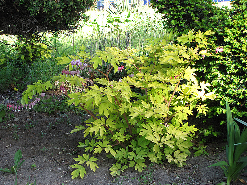 Gold Heart Bleeding Heart will grow to be about 3 feet tall at maturity, with a spread of 3 feet. When grown in masses or used as a bedding plant, individual plants should be spaced approximately 30 inches apart. It grows at a medium rate, and under ideal conditions can be expected to live for approximately 15 years. As an herbaceous perennial, this plant will usually die back to the crown each winter, and will regrow from the base each spring. Be careful not to disturb the crown in late winter when it may not be readily seen! As this plant tends to go dormant in summer, it is best interplanted with late-season bloomers to hide the dying foliage.