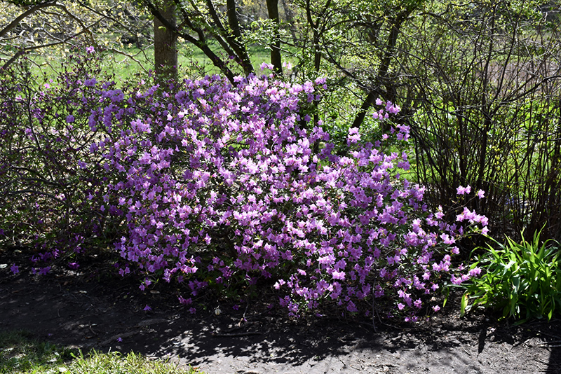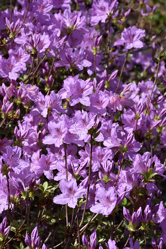 Compact Korean Azalea is smothered in stunning clusters of lightly-scented lilac purple trumpet-shaped flowers with purple spots at the ends of the branches in mid spring before the leaves. It has forest green evergreen foliage. The narrow leaves turn an outstanding purple in the fall, which persists throughout the winter.