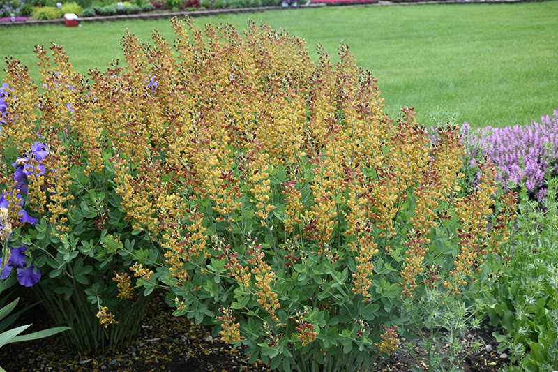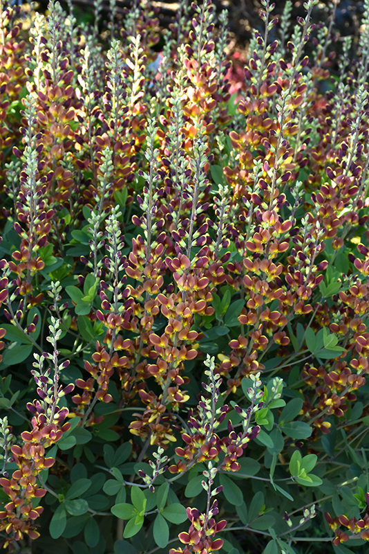 Decadence® Cherries Jubilee False Indigo will grow to be about 28 inches tall at maturity, with a spread of 3 feet. It tends to be leggy, with a typical clearance of 1 foot from the ground, and should be underplanted with lower-growing perennials. It grows at a slow rate, and under ideal conditions can be expected to live for approximately 25 years. As an herbaceous perennial, this plant will usually die back to the crown each winter, and will regrow from the base each spring. Be careful not to disturb the crown in late winter when it may not be readily seen!