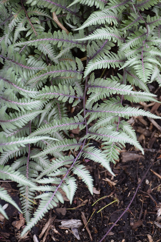 A massive, arching clump of silvery fronds with green highlights and purple stems; prefers moist, loamy soils; a great filler for shady borders