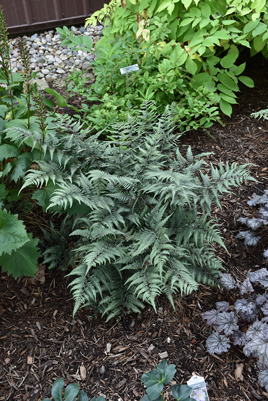 Godzilla Giant Japanese Painted Fern will grow to be about 3 feet tall at maturity, with a spread of 6 feet. When grown in masses or used as a bedding plant, individual plants should be spaced approximately 3 feet apart. Its foliage tends to remain dense right to the ground, not requiring facer plants in front. It grows at a slow rate, and under ideal conditions can be expected to live for approximately 15 years. As an herbaceous perennial, this plant will usually die back to the crown each winter, and will regrow from the base each spring. Be careful not to disturb the crown in late winter when it may not be readily seen!