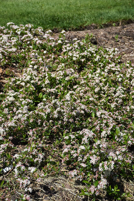 A low, spreading variety with glossy dark green leaves, and showy white flowers in spring; a great choice for edging and groundcover; brilliant red foliage in fall to contrast the dark purple-black fruit; very adaptable and grows well in tough conditions
