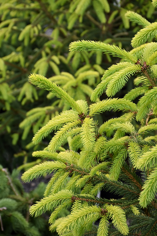 An attractive form of this popular spruce featuring bright lemon yellow emerging foliage; in summer, the undersides and shaded interior foliage turns lime green; a fine color accent tree that creates a striking contrast in the landscape