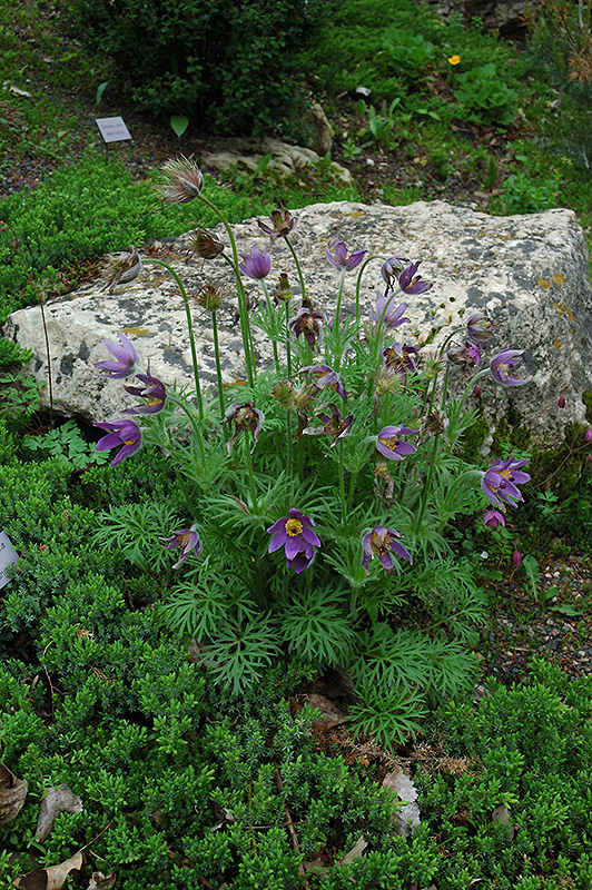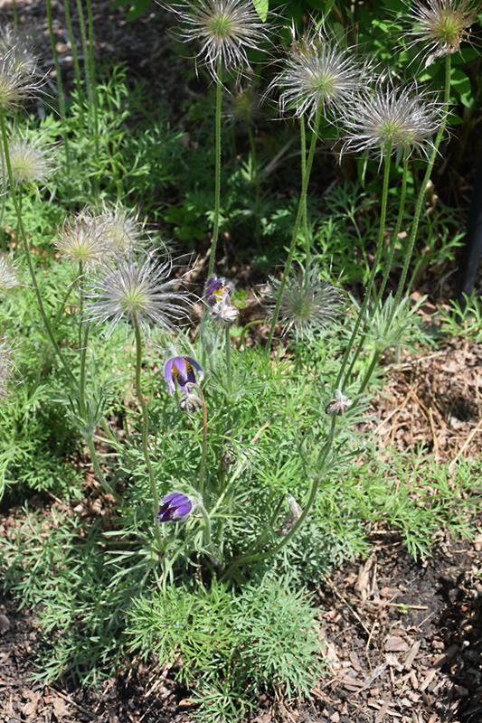 Pasqueflower has purple cup-shaped flowers with yellow eyes at the ends of the stems from early to mid spring, which are interesting on close inspection. The flowers are excellent for cutting. Its deeply cut ferny compound leaves remain green in color throughout the season. The silver fruits are carried on plumes from early summer to early fall.