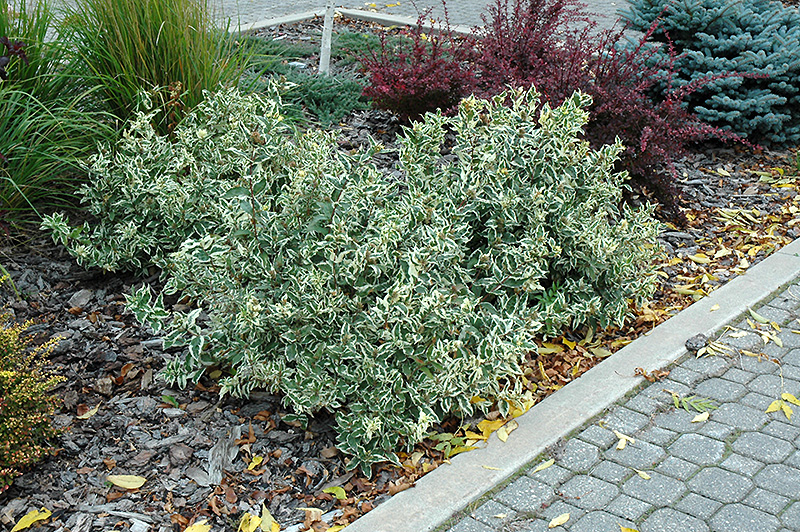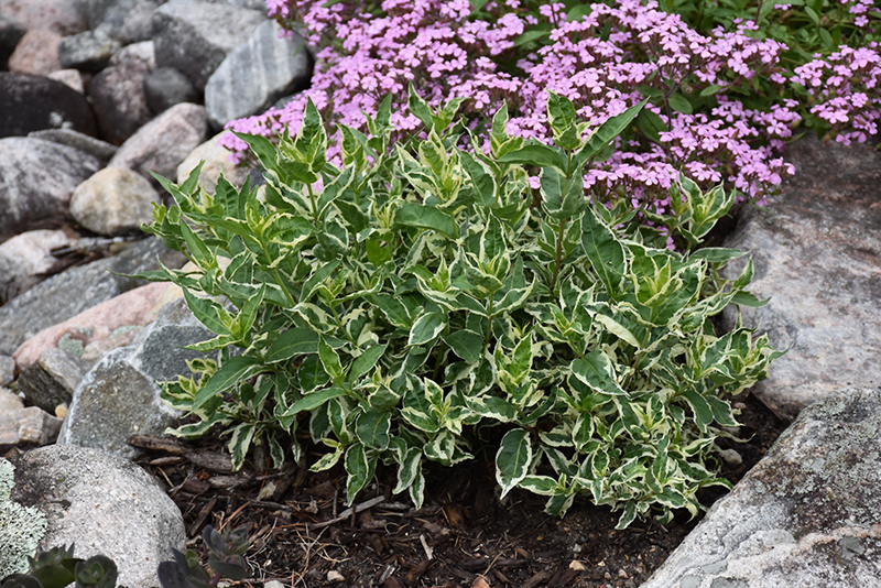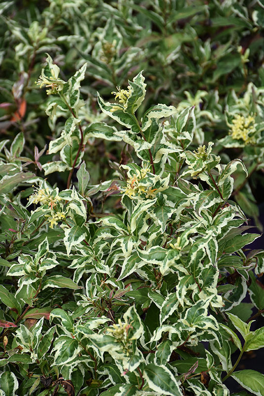 Cool Splash® Bush Honeysuckle is primarily valued in the landscape or garden for its cascading habit of growth. It features subtle panicles of yellow trumpet-shaped flowers along the branches in early summer. It has attractive white-variegated dark green foliage. The oval leaves are highly ornamental but do not develop any appreciable fall color.