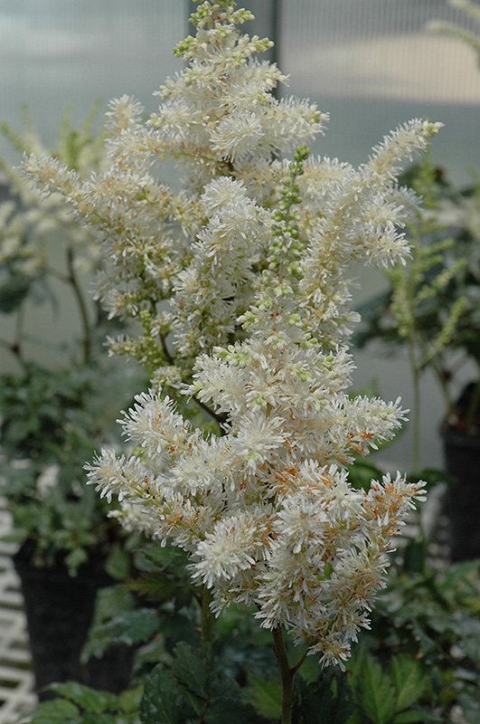 Visions In White Astilbe will grow to be about 12 inches tall at maturity extending to 18 inches tall with the flowers, with a spread of 12 inches. When grown in masses or used as a bedding plant, individual plants should be spaced approximately 12 inches apart. Its foliage tends to remain dense right to the ground, not requiring facer plants in front. It grows at a medium rate, and under ideal conditions can be expected to live for approximately 10 years. As an herbaceous perennial, this plant will usually die back to the crown each winter, and will regrow from the base each spring. Be careful not to disturb the crown in late winter when it may not be readily seen!