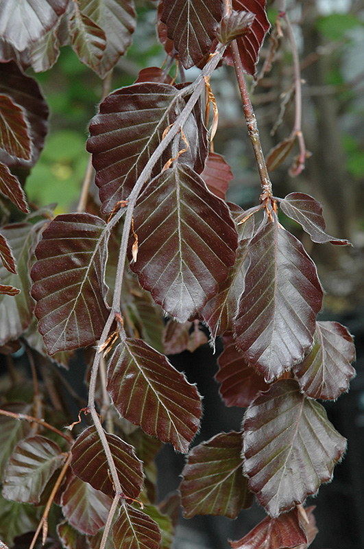 An incredible accent tree with smooth gray bark and cascading branches; glossy burgundy leaves in spring turn to green; leaves are coppery in fall; a most stately specimen;particular about growing conditions, requires rich soil and moisture; smaller beech