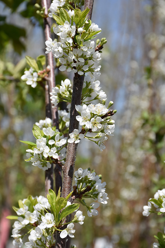A shrubby fruit tree with showy clusters of white flowers in spring followed by luscious black plums in mid-summer, variable growth habit; this is actually a cross between a cherry-plum and a plum so it's slightly hardier than most plums