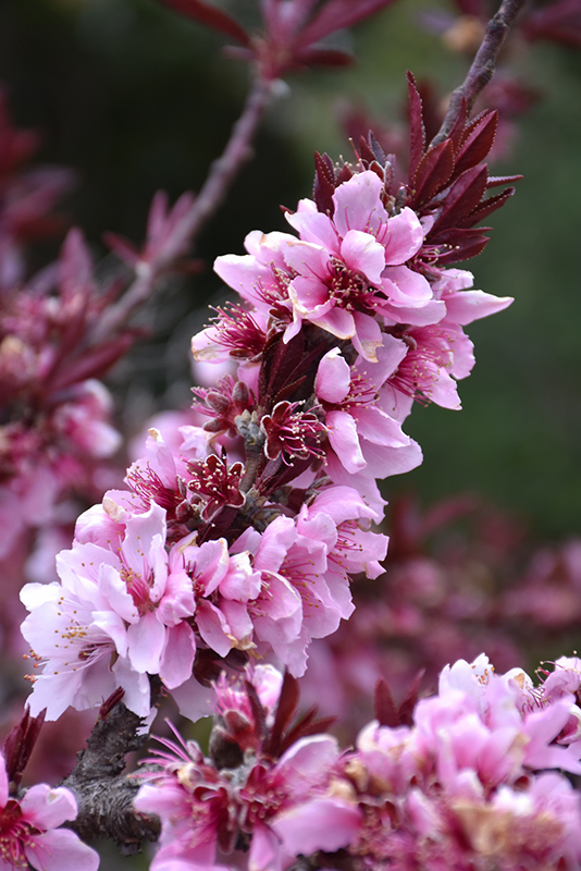 A popular dwarf peach that is quite ornamental, with showy pink flowers in spring and a low, spreading habit; stunning burgundy-purple leaves all season long; will tolerate some shade but needs full sun most of the time and well-drained soil