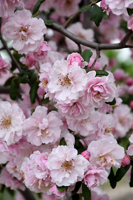 Prairie Rose Flowering Crab is clothed in stunning clusters of double pink flowers along the branches in early spring. It has dark green deciduous foliage. The pointy leaves turn yellow in fall.