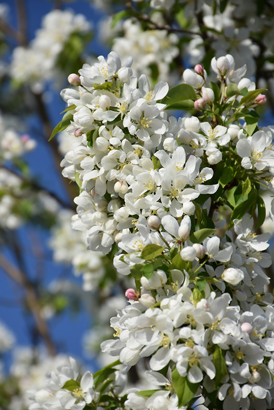 Dolgo Apple is smothered in stunning clusters of fragrant white flowers along the branches in mid spring, which emerge from distinctive shell pink flower buds before the leaves. It has dark green deciduous foliage. The pointy leaves turn yellow in fall. The fruits are showy red apples carried in abundance from late summer to mid fall. The fruit can be messy if allowed to drop on the lawn or walkways, and may require occasional clean-up.