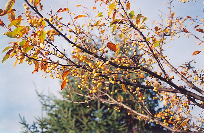 A wonderful ornamental tree with a profusion of white flowers in spring and showy and persistent golden fruit in fall, very upright habit of growth; makes a spectacular front yard accent, needs well-drained soil and full sun