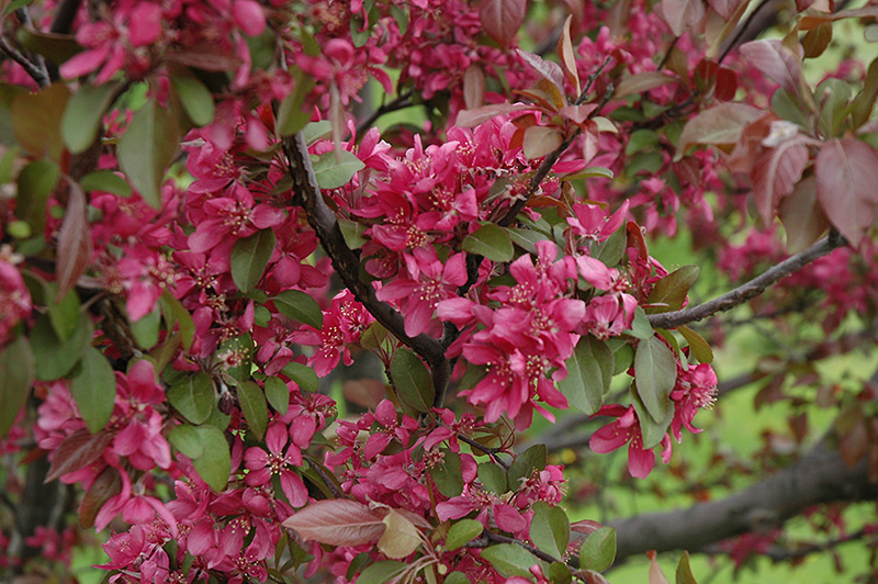 Profusion Flowering Crab is bathed in stunning clusters of fragrant cherry red flowers along the branches in mid spring, which emerge from distinctive dark red flower buds before the leaves. It has attractive coppery-bronze-tipped dark green foliage which emerges purple in spring. The pointy leaves are highly ornamental and turn yellow in fall. The fruits are showy ruby-red pomes carried in abundance from early to late fall.